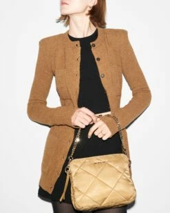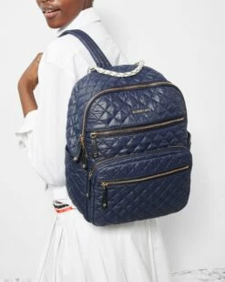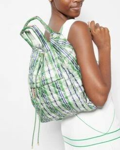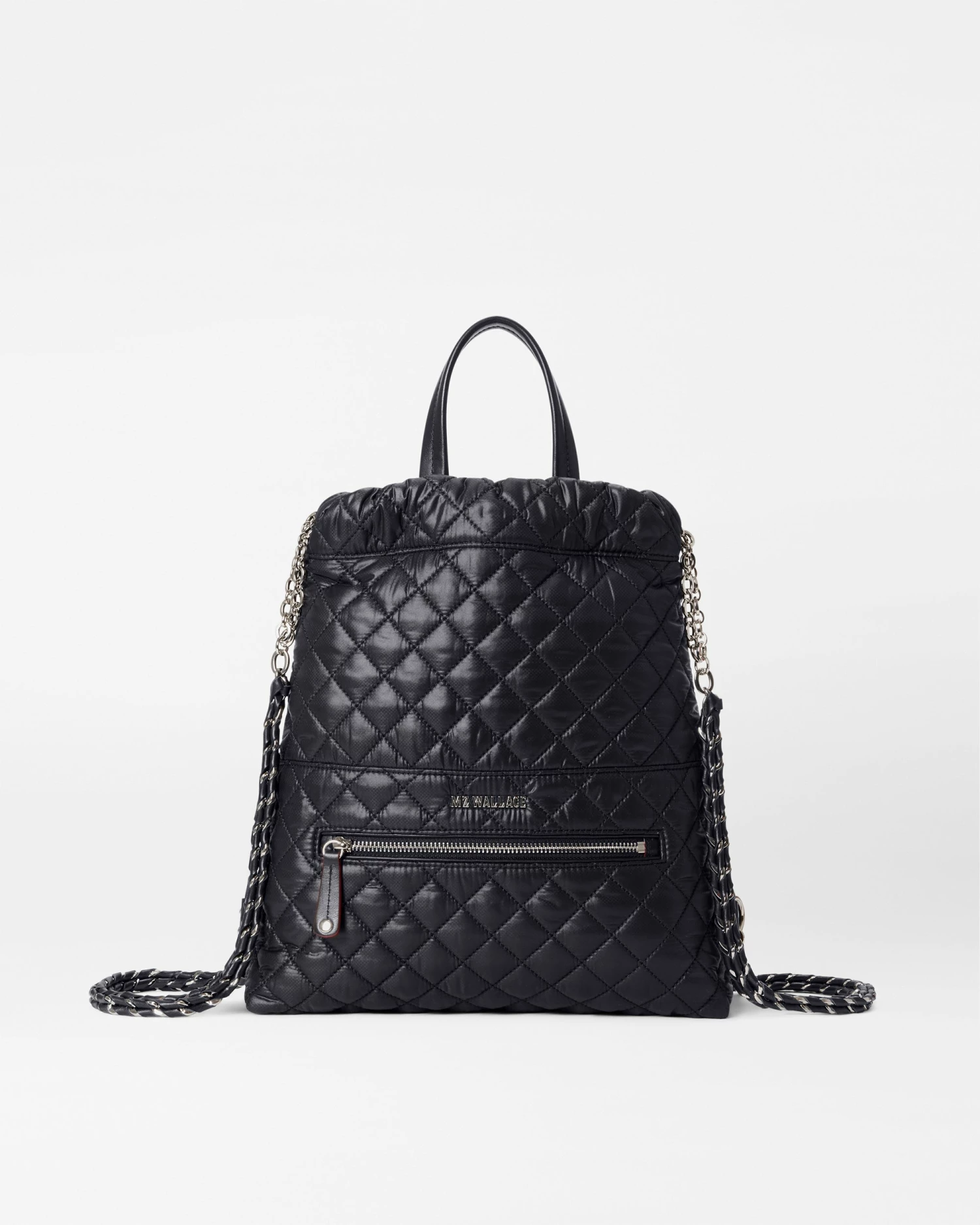 Our new two-toned quilted Italian leather drawstring backpack has woven chain straps that secure the closure so you can grab and go.