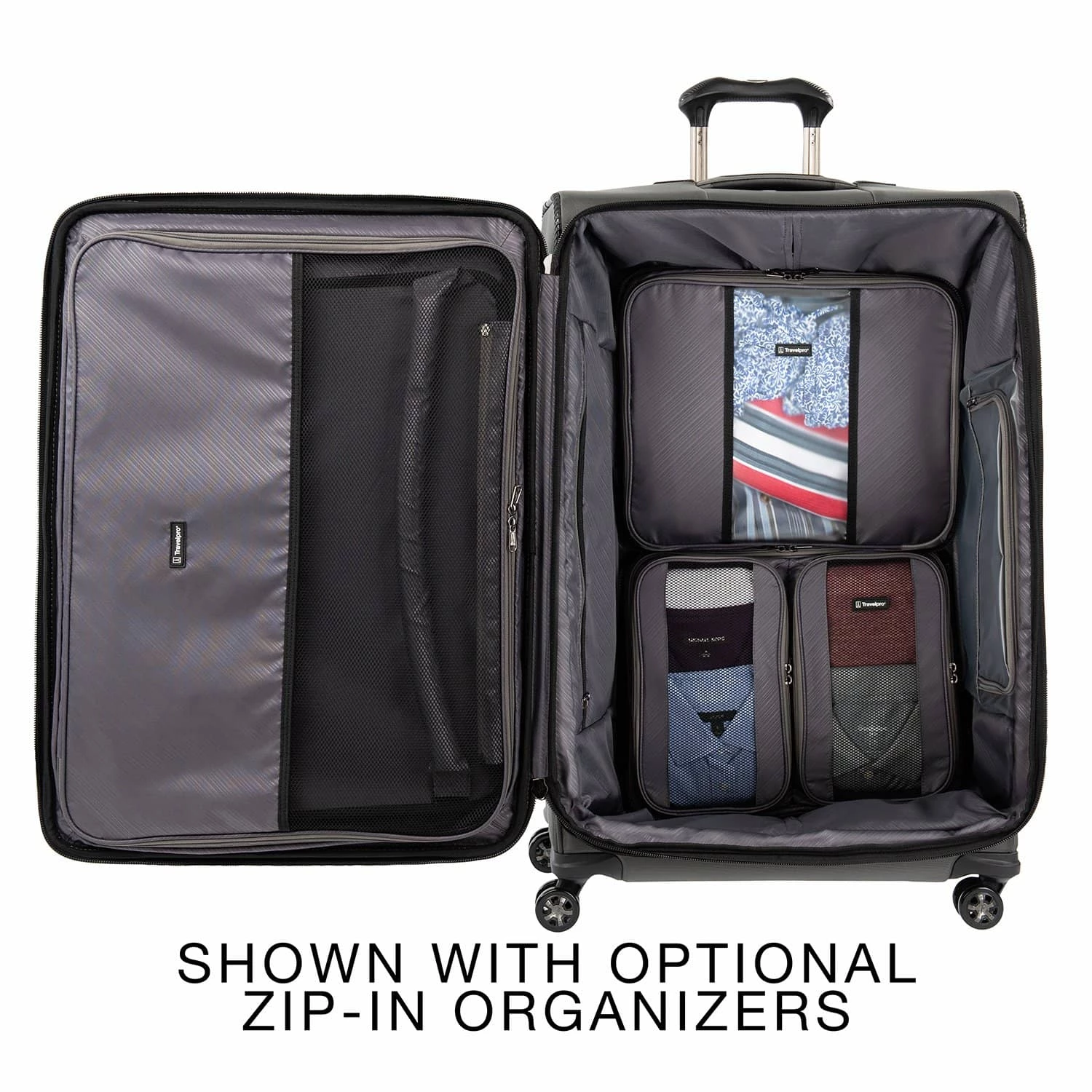 Inside, a built-in, fold-out suiter system protects against wrinkles while adjustable hold-down straps, water-resistant storage and an accessory pocket keep you organized with convenience and flexibility. Wherever you journey and no matter how much you pack, enjoy precise control and effortless roll with the PrecisionGlide™ System–eight ultra-durable, 360° MagnaTrac® self-aligning spinner wheels led by a four-stop, height-adjustable PowerScope Handle with comfortable Contour Grip.
