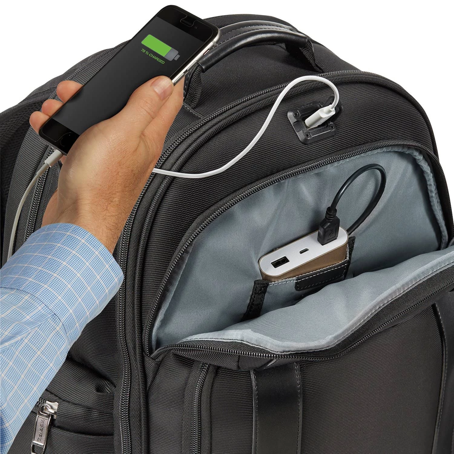 Smart styling meets intuitive function with this professional backpack that gives you charging power with an external USB port connected to a power bank (not included) and dedicated battery pocket for convenience and FAA compliance. Padded laptop and tablet pockets protect electronics, while a Travelpro® ID TheftBlock™ pocket safeguards credit cards and passports against loss and identity theft. Durable, ballistic nylon fabric with DuraGuard® coating resists stains and abrasions, while leather trim adds polish and professionalism.