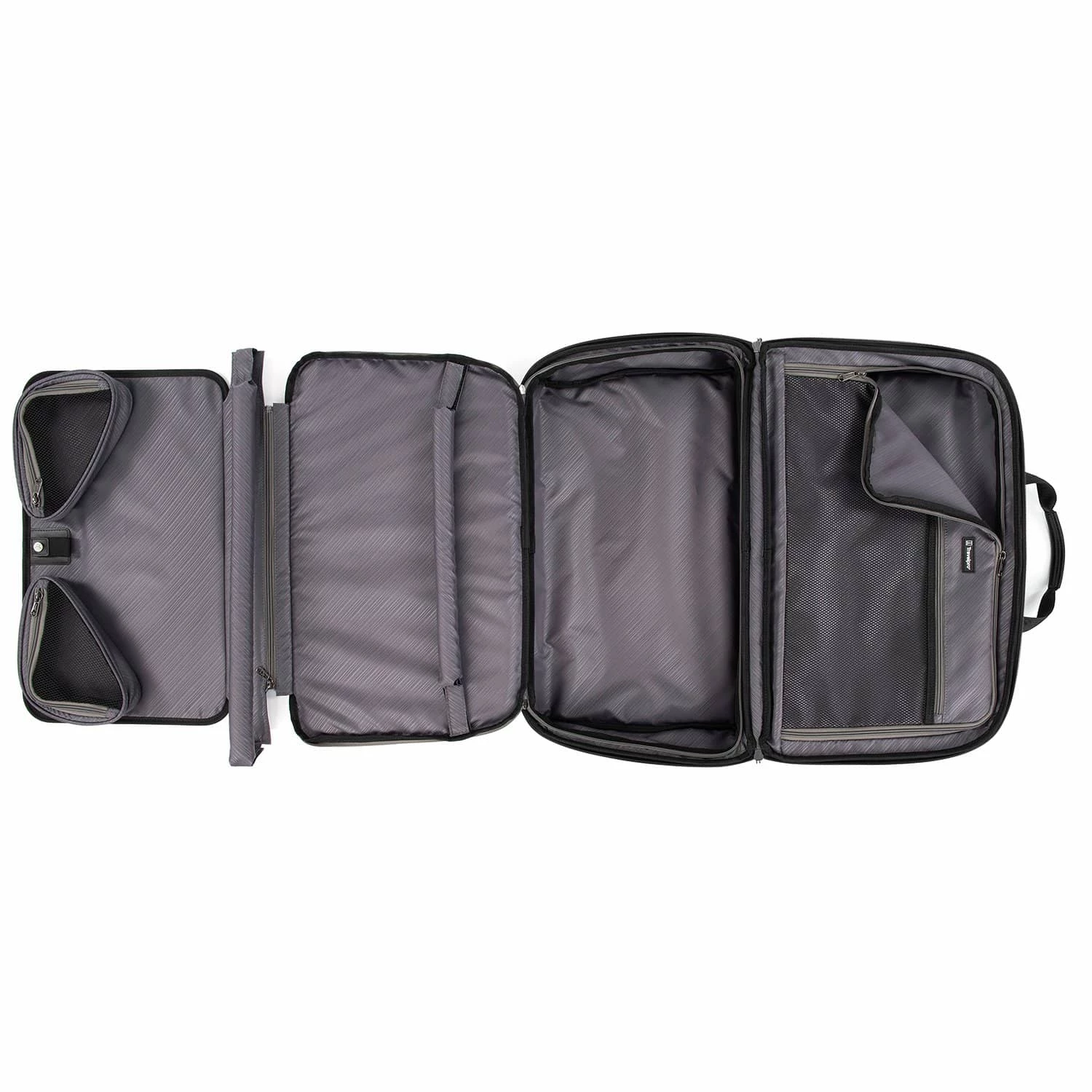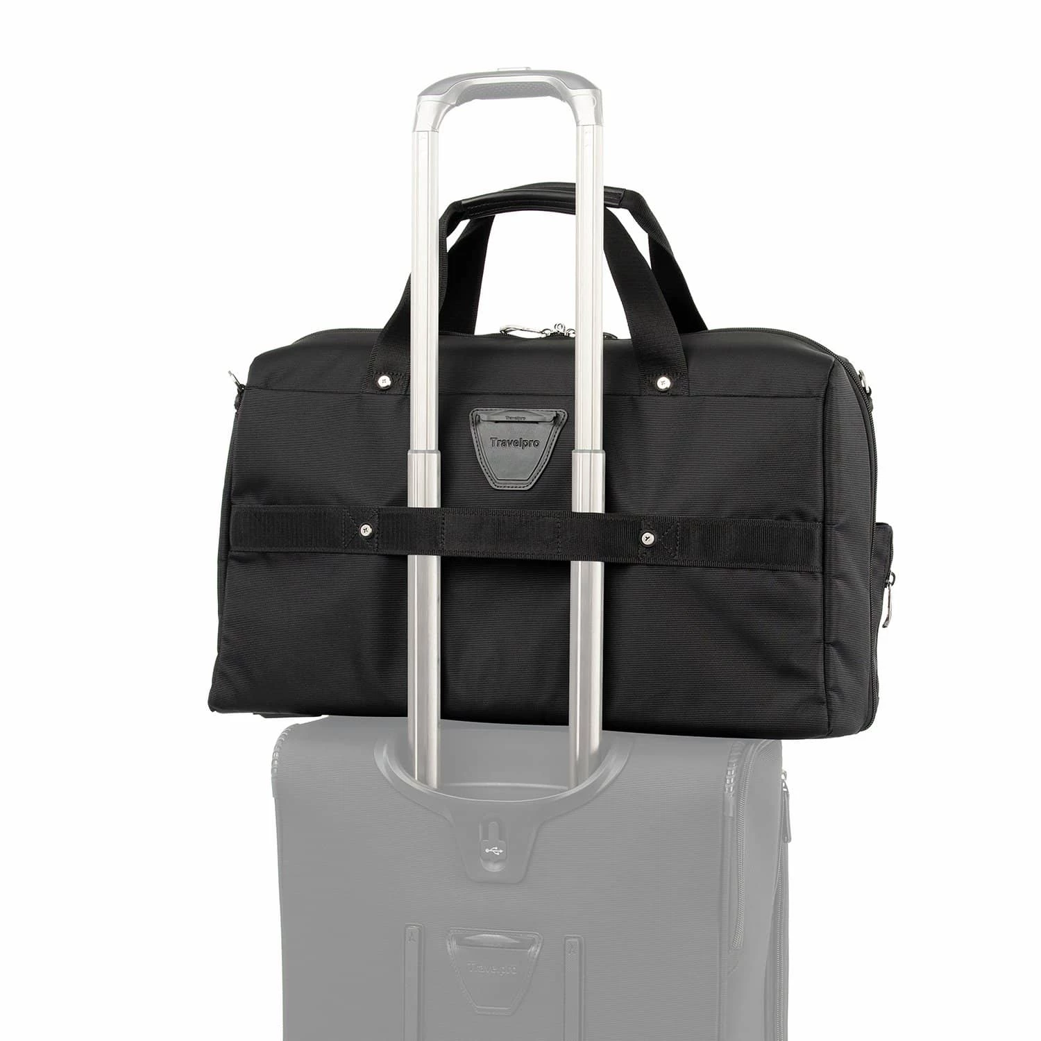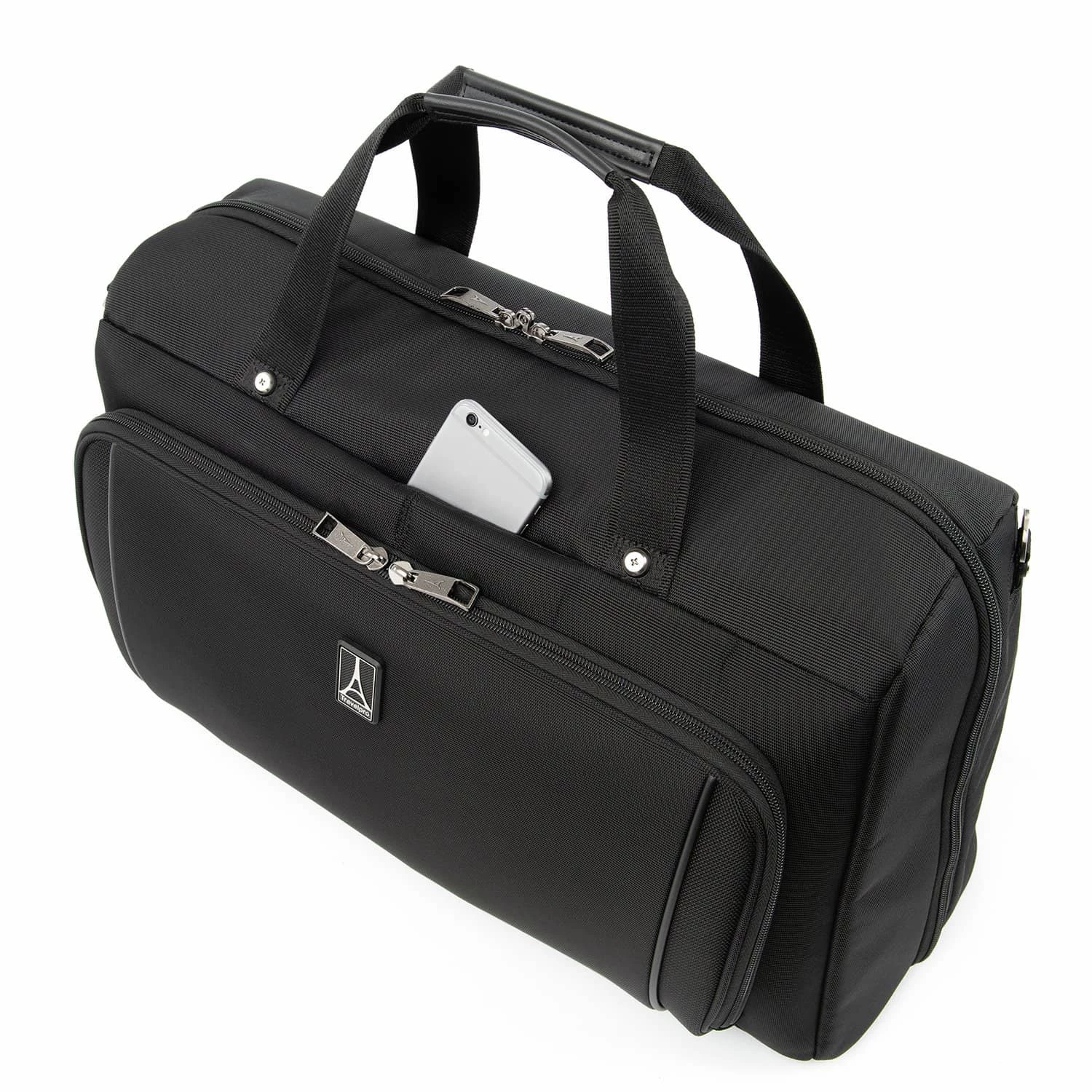 Carrying options include dual handles, a removable adjustable shoulder strap and a rear stacking strap that fits around the extension handle of a Rollaboard® or spinner suitcase for secure stacking and hands-free mobility.