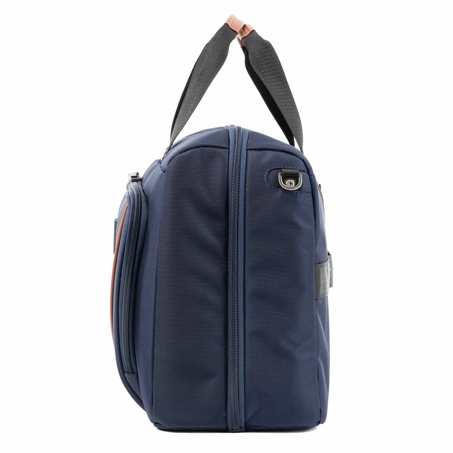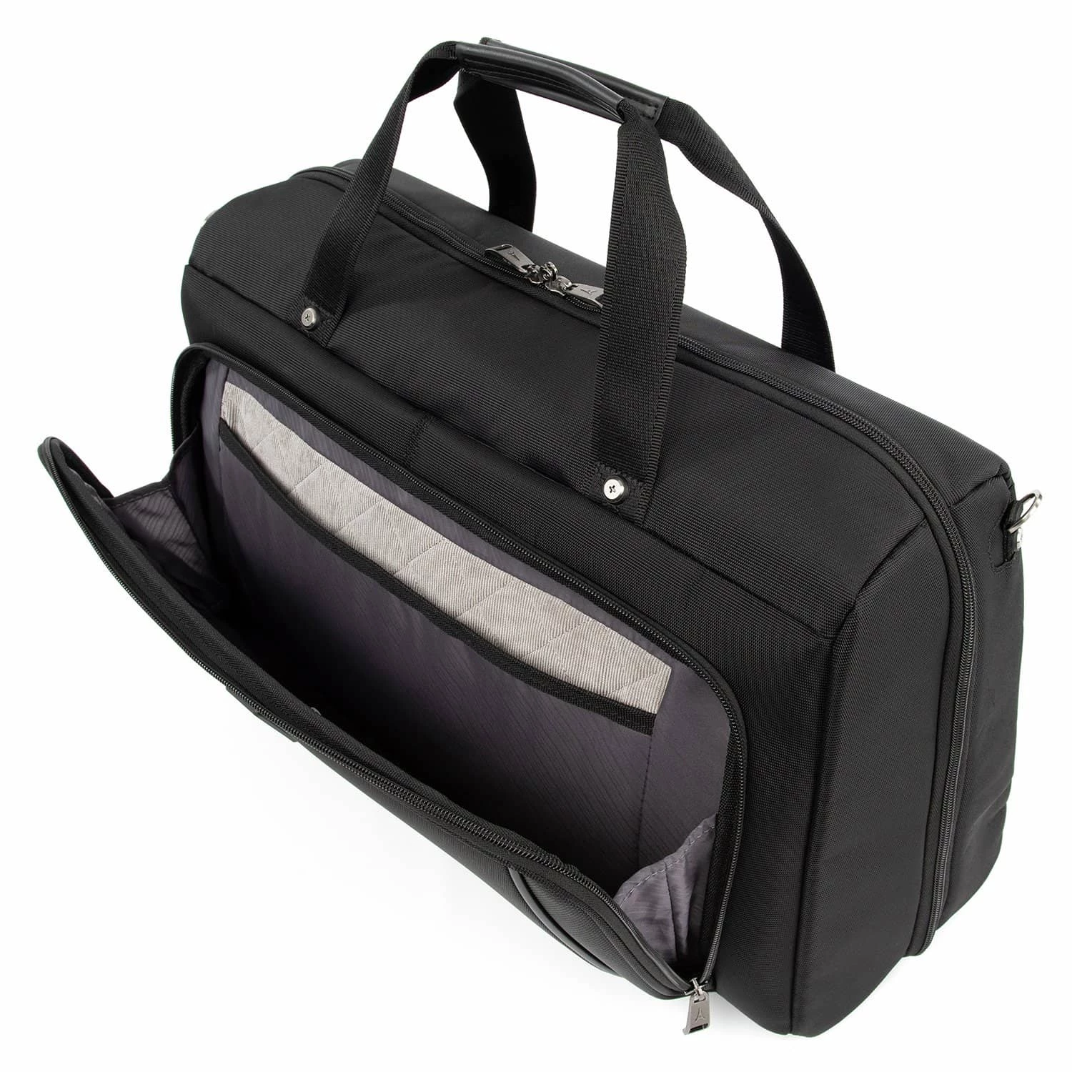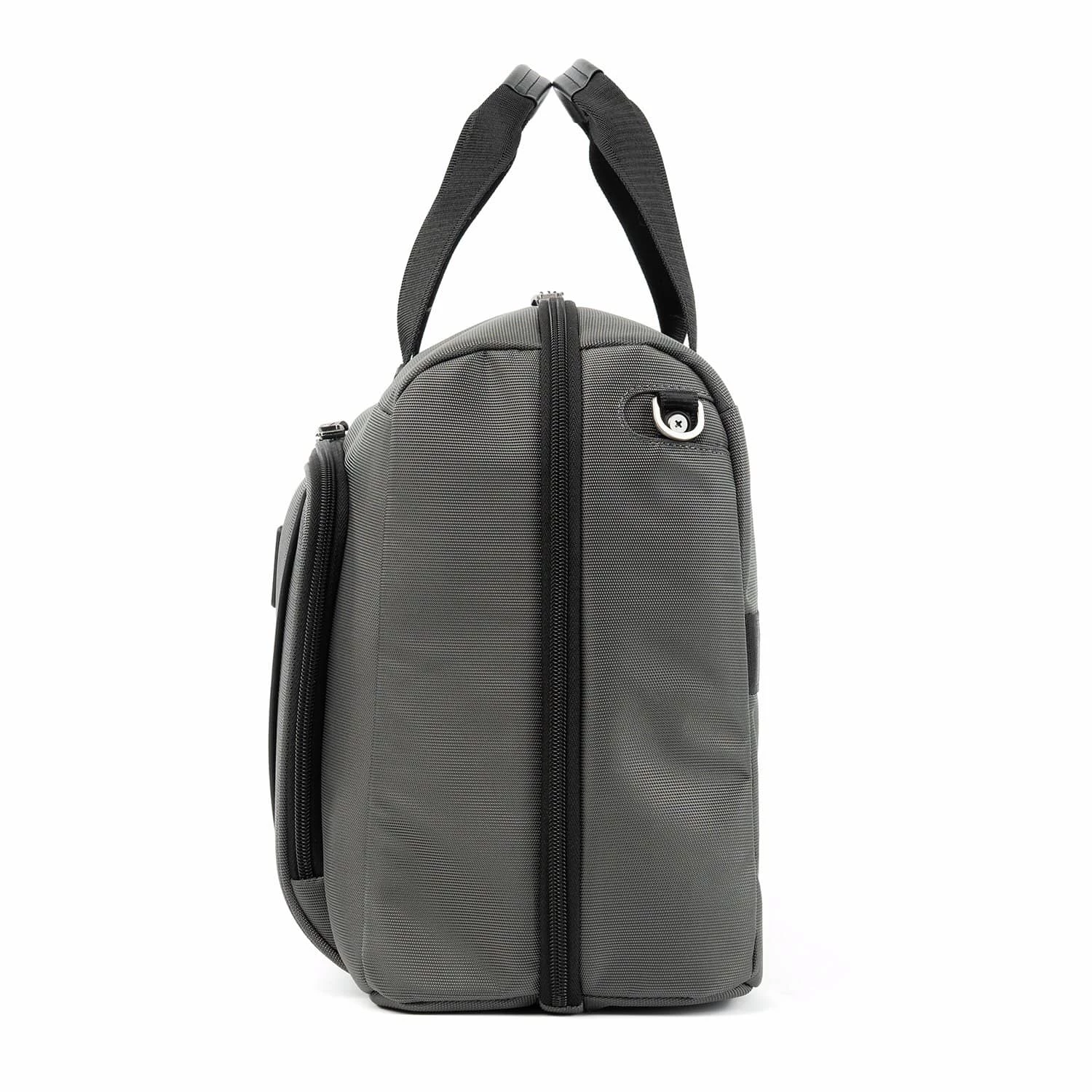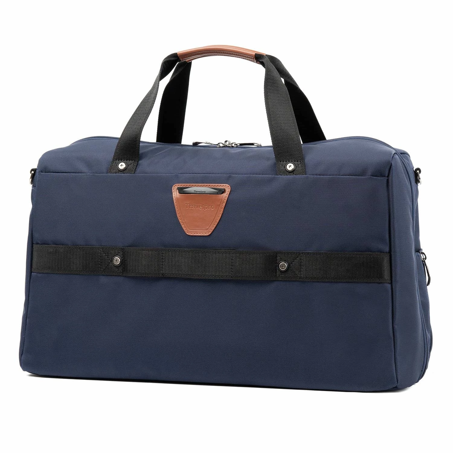 Carrying options include dual handles, a removable adjustable shoulder strap and a rear stacking strap that fits around the extension handle of a Rollaboard® or spinner suitcase for secure stacking and hands-free mobility.