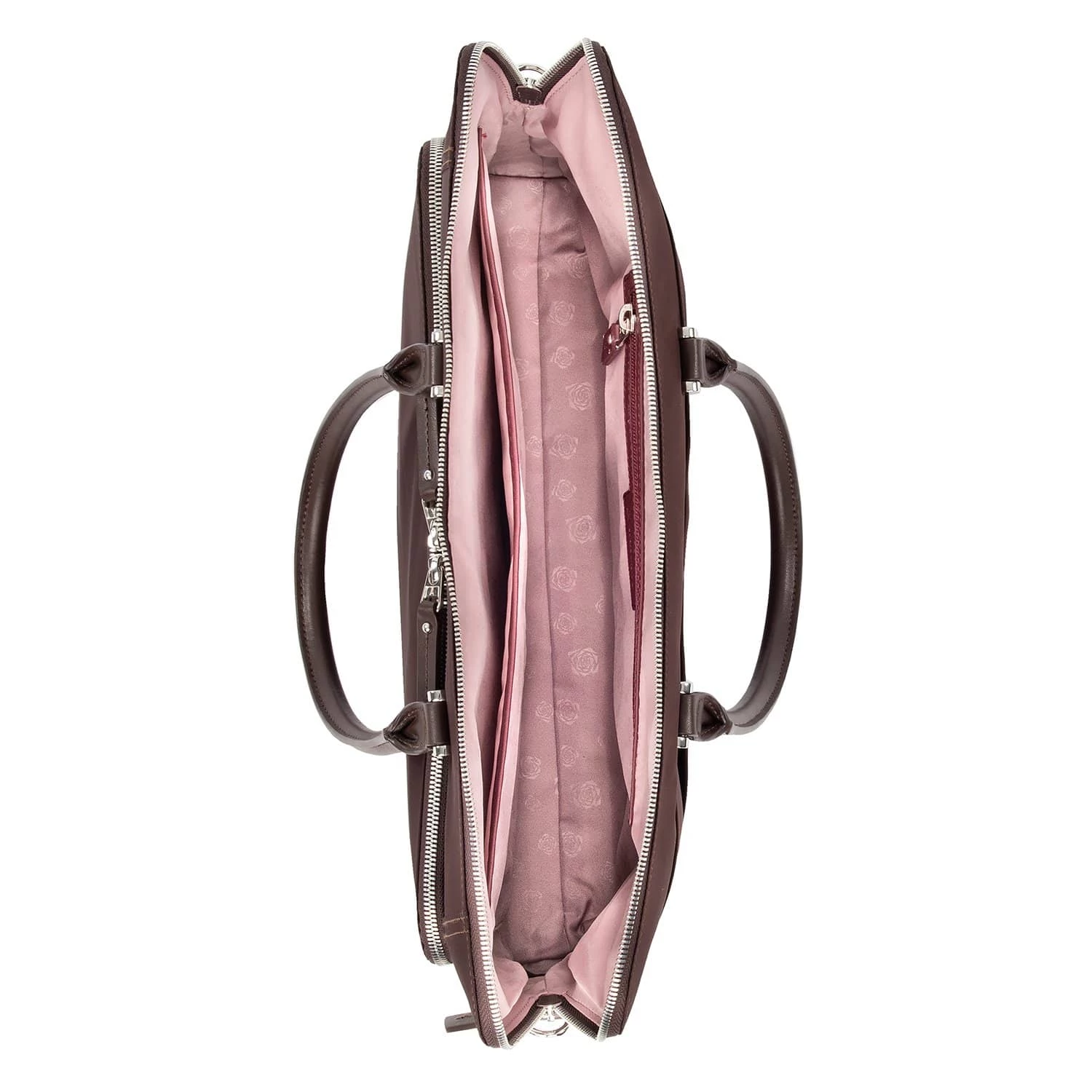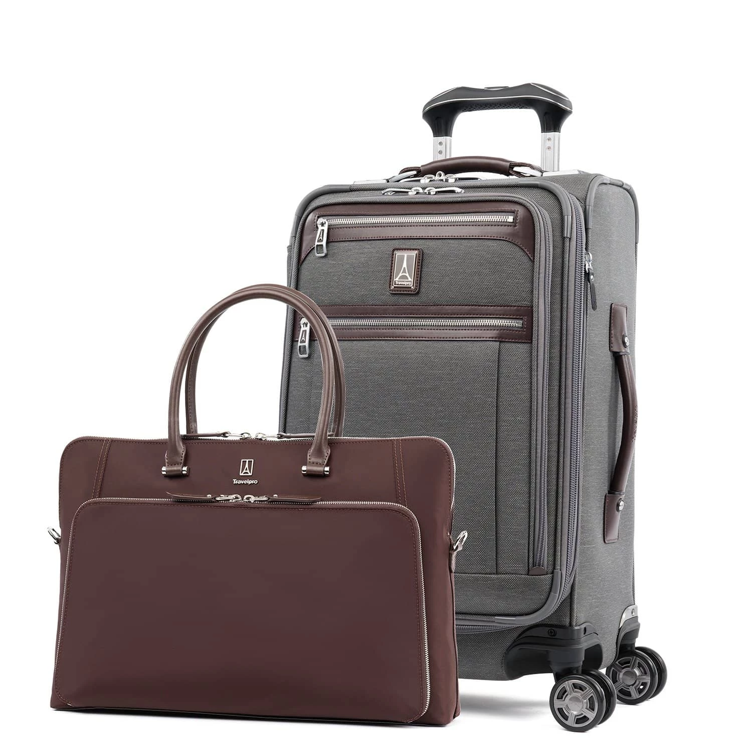 Stylish, sophisticated and totally together, the Platinum® Elite Women’s Brief and 21” Spinner give you organization and ease that look as good as they perform. Great for everyday use and outfitted for travel, this brief puts the beauty back in business and keeps everything you need right where you want it. Features include genuine leather accents, a padded laptop/tablet sleeve, built-in organizers, a Travelpro® QuickSlip™ pocket with magnetic closure, which is perfect for cell phone storage and a rear strap that lets you securely stack the brief on top of the spinner for hands-free mobility.
