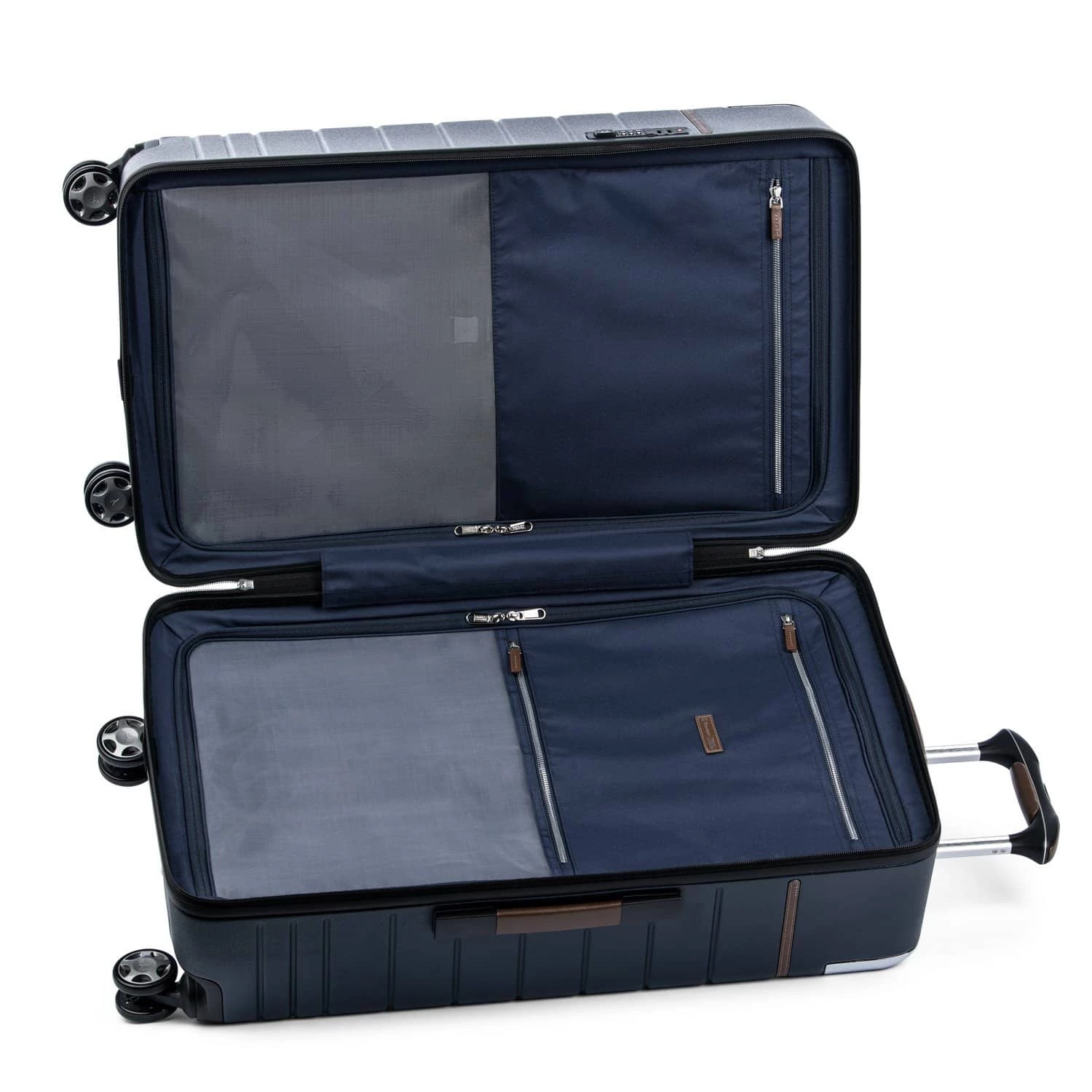 Beauty and brawn unite with a 100% polycarbonate exterior hard shell that is gently texturized to minimize visible scuffs, eye-catching zinc corner armor that protects high-impact areas in style and genuine leather trim and carry handles that provide elegant distinction and lasting resilience. An integrated TSA lock adds a layer of protection while allowing authorities to unlock and relock the bag as required for inspection.